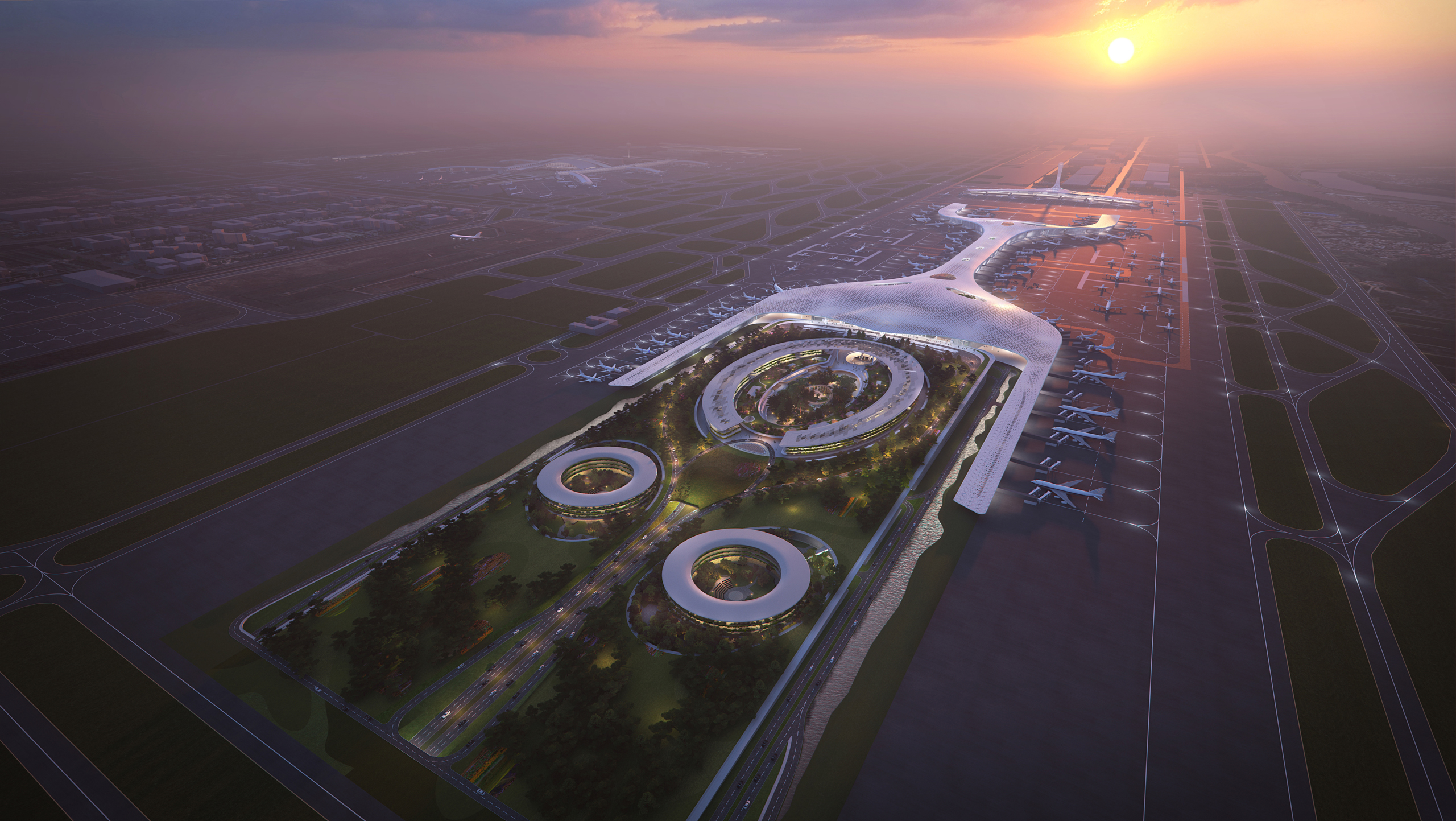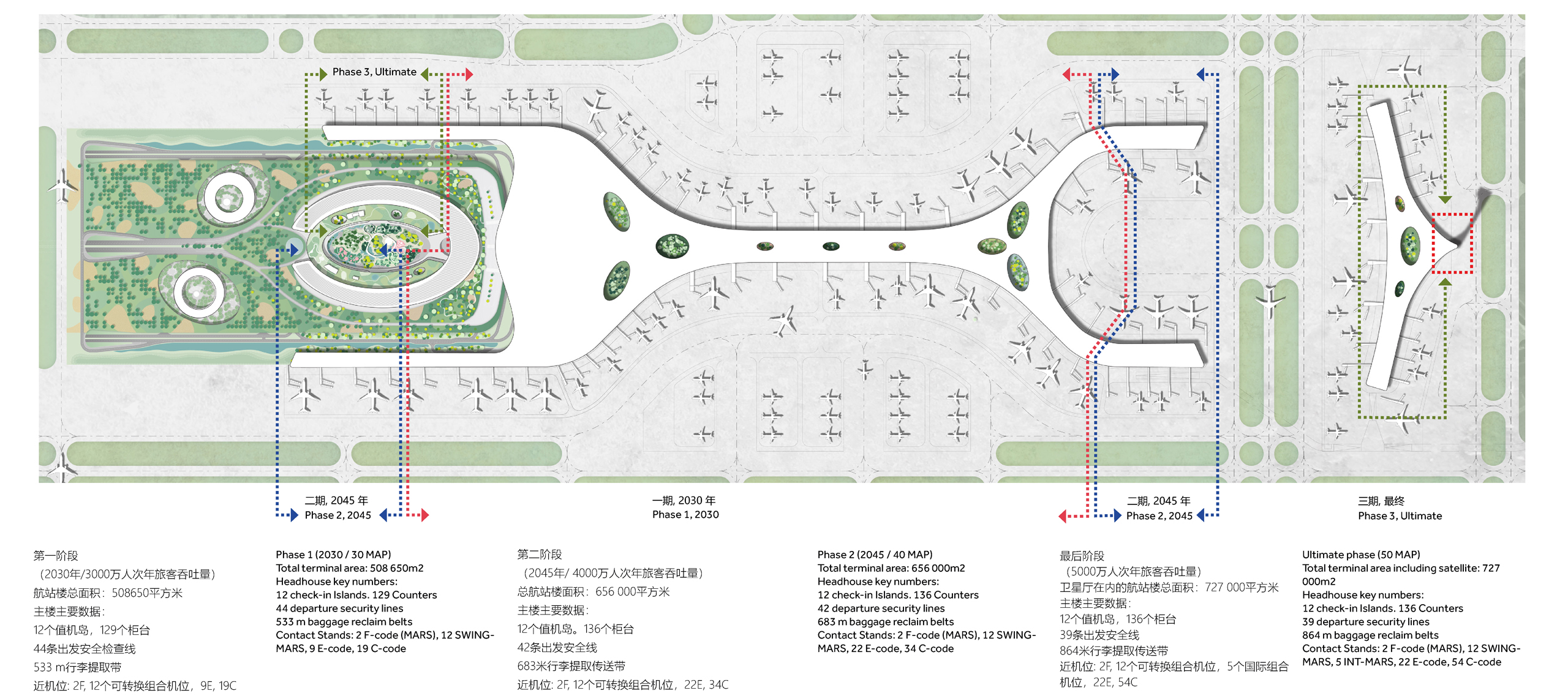 Environmental considerations are central to the design, with a focus on low carbon, water, and energy consumption, as well as adaptability to future challenges. The efficient layout of the terminal maximizes space utilization and airside flexibility, accommodating various aircraft types and future fleet changes. Additionally, provisions for technological advancements and potential expansions ensure that the airport remains efficient and capable of meeting evolving passenger needs.